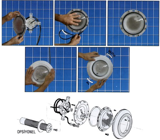 Прожекторите за подводно осветление в басейните са изработени от пластмаса ABS с UW устойчивост. Предлагат се варианти и с декоративна част от неръждаема стомана. Плоските прожектори модел FLAT е предназначен за монтаж на вече построени басейни или при конструкции, при които не е желателно вкопаване или пробиване на стените. Всички останали модели се монтират чрез вграждане в стената на басейна.